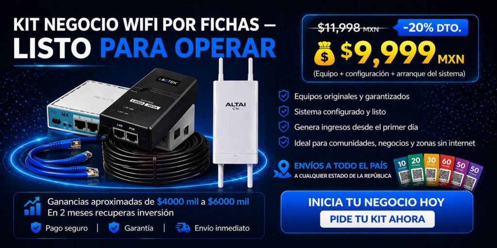 Destacados Añadir al carritoPrecio de lista:$753.85Precio de venta:$499.89Kit Negocio WiFi por Fichas Profesional – Listo para Operar