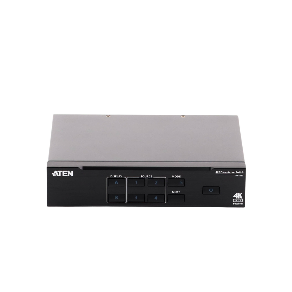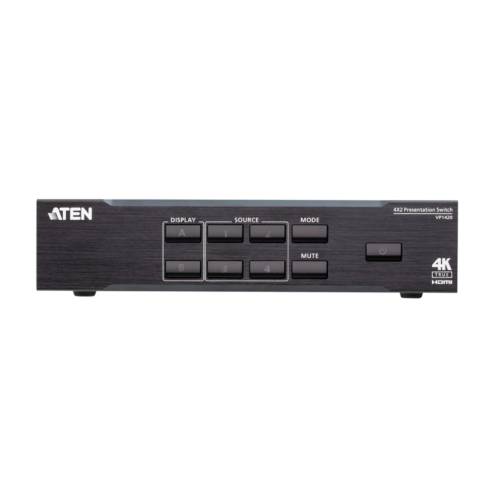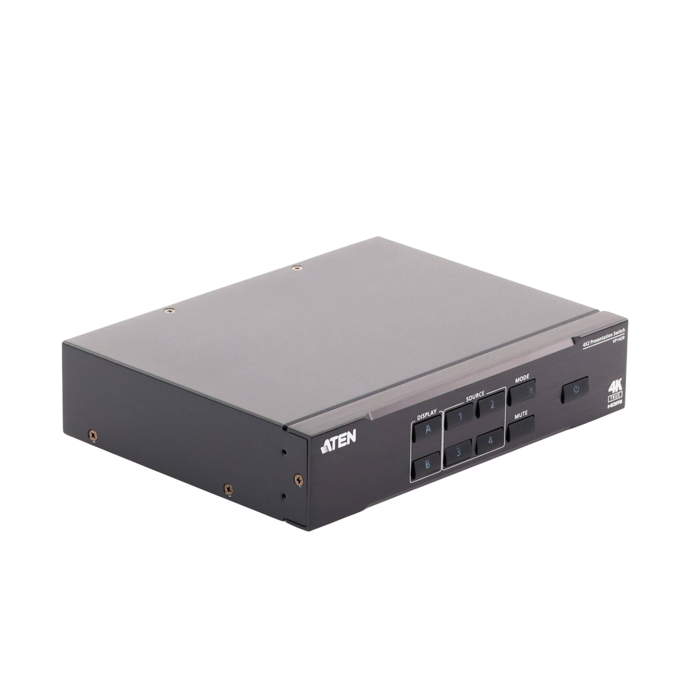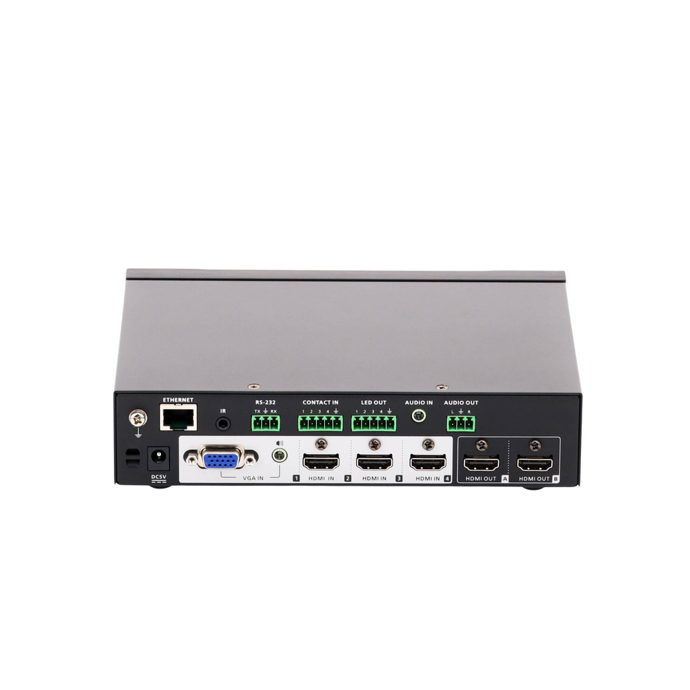 Switch presentación multifunción que integra funciones de matriz de vídeo, escalador True 4K, procesador de audio y convertidor analógico a digital en un dispositivo compacto. Con cuatro entradas analógicas/digitales y dos salidas HDMI, está diseñado para aumentar el impacto de cualquier presentación profesional en salas de reuniones de tamaño pequeño a mediano.