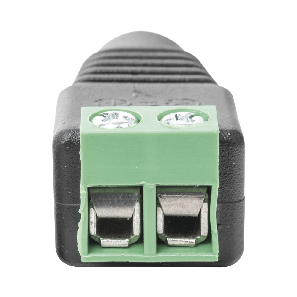 Adaptador tipo jack de 3.5 mm hembra polarizado de 12 Vcc con terminales tipo tornillo.