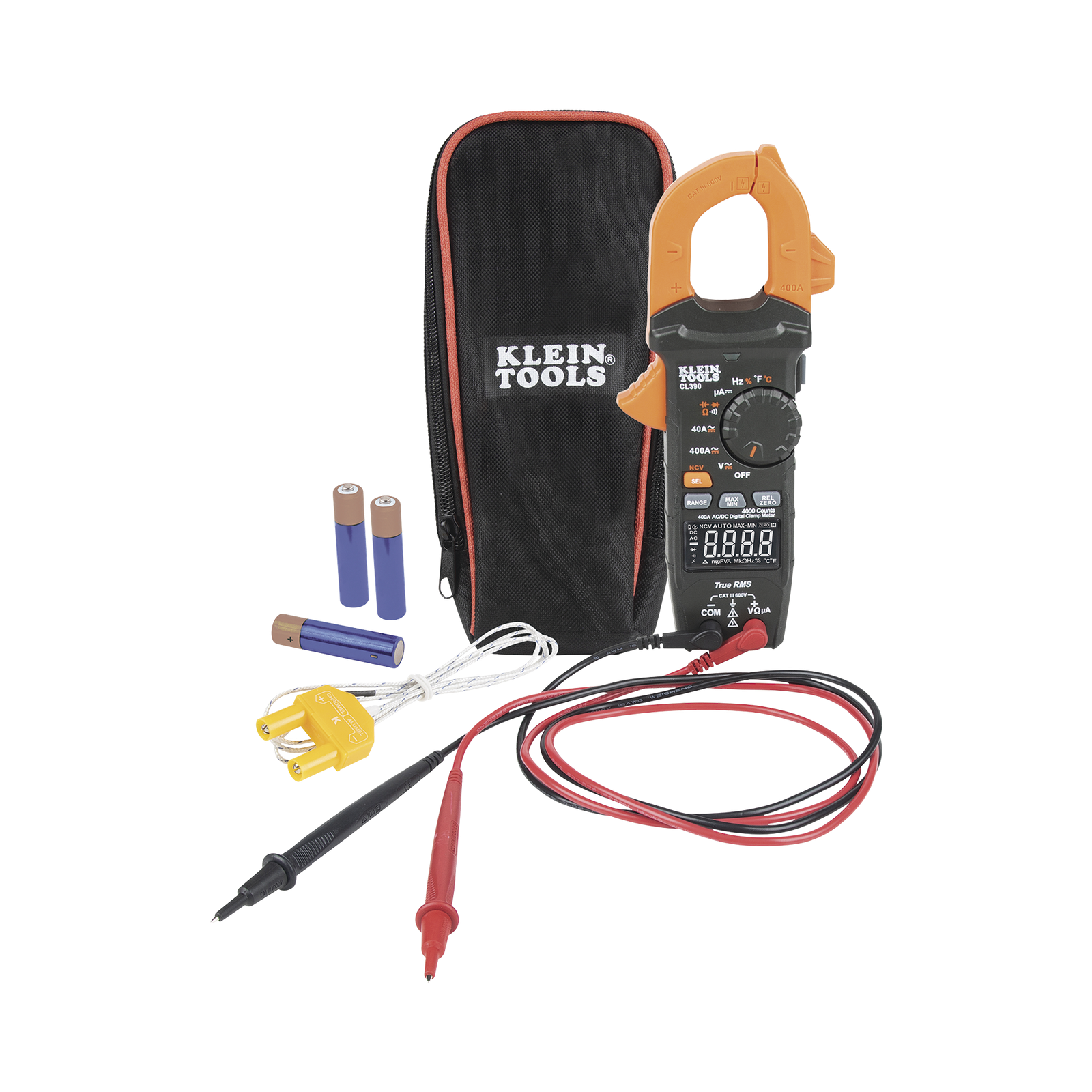 - Incluye un estuche para transporte, cables de prueba con capuchones de seguridad CAT III/CAT IV, termopar, instrucciones y 3 baterías AAA.