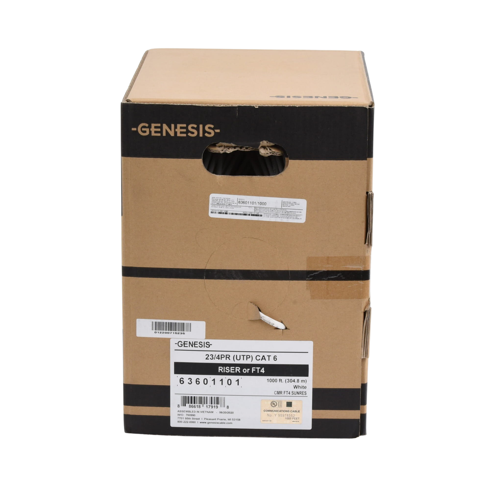 Impresión en cubierta: GENESIS P/N 6360 4PR23 CAT 6 E175104-1 (UL) CMR C(UL)US FT4 SUN RES 75C (RoHS)