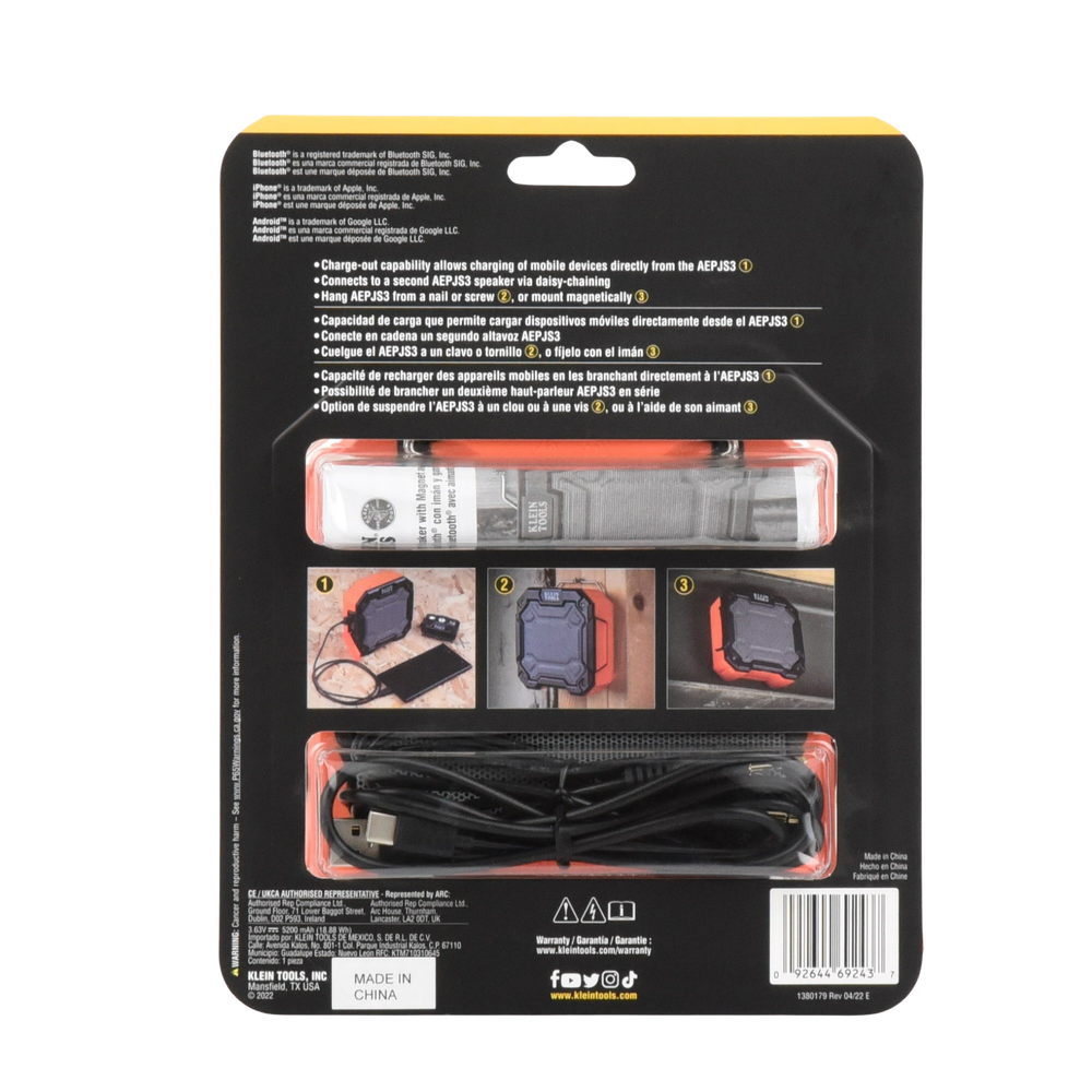 - Altavoz Bluetooth® recargable que se carga en 3 horas o menos utilizando el cable USB-A a USB-C incluido de 39” (99 cm) de largo