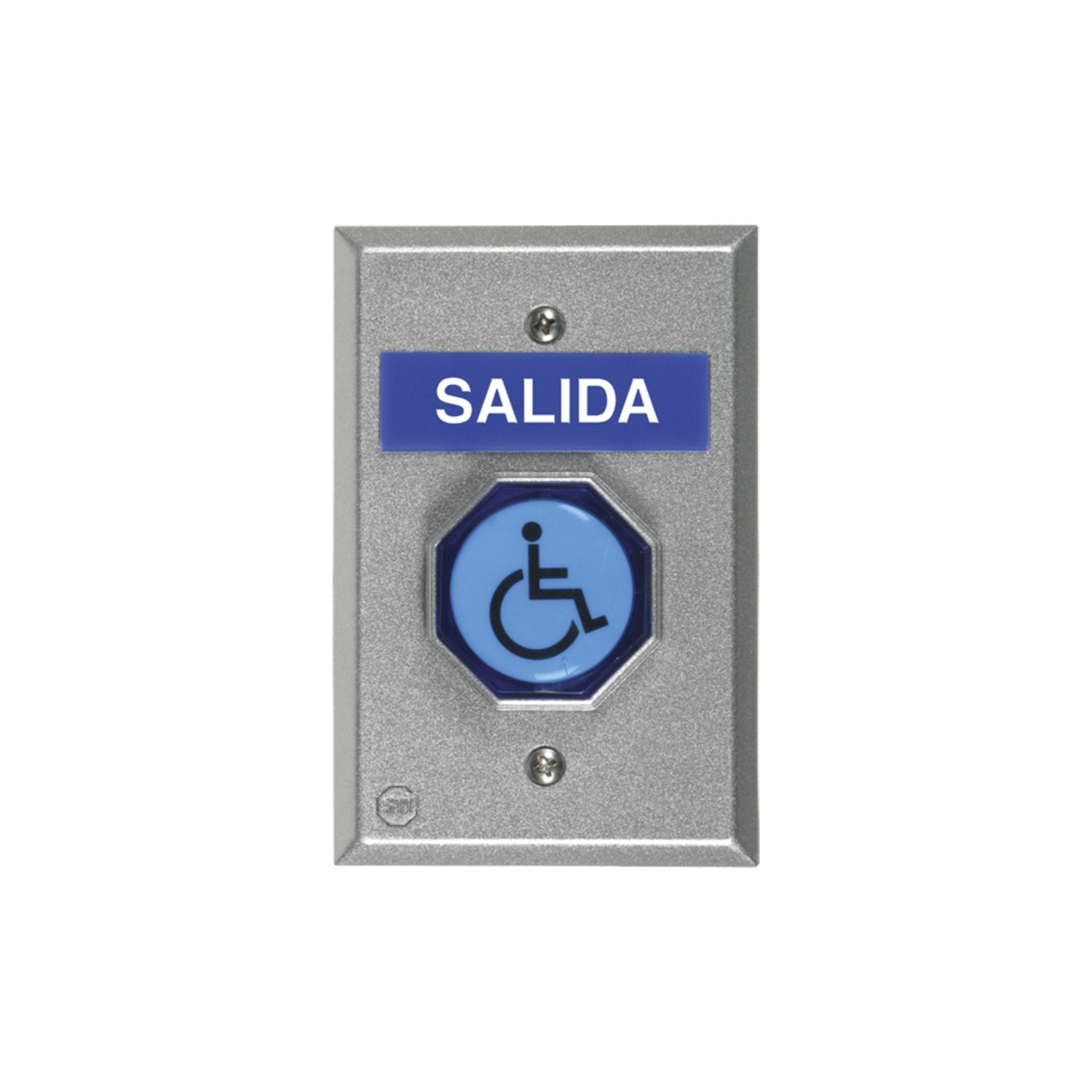 - Incluye cinco insertos para el pulsador – SALIDA, OPRIMA, EMPUJAR PARA SALIR, símbolo de discapacitado o en blanco