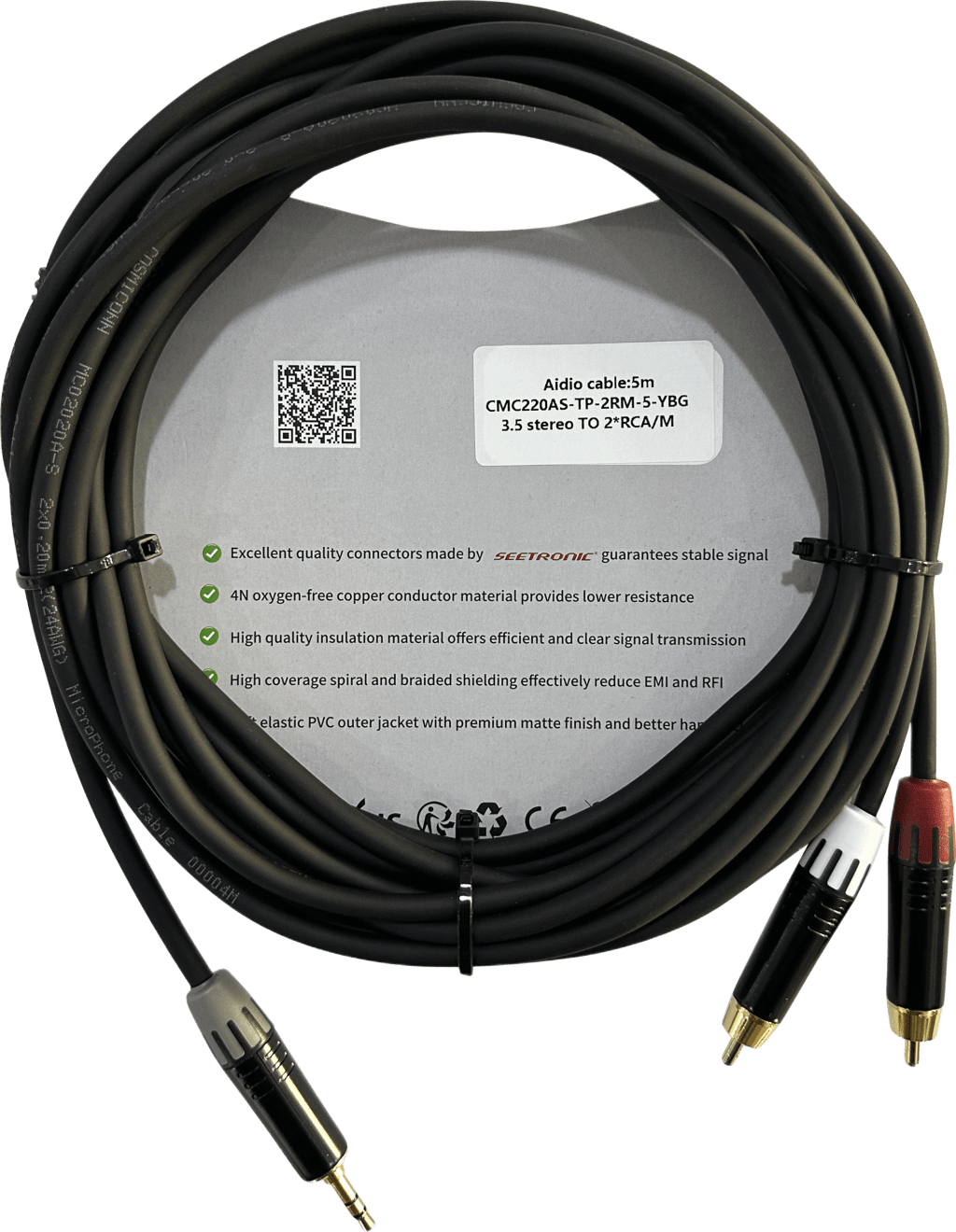 Cable 3.5mm a 2 RCA, conectores negros, con diferenciador de blanco y rojo en RCA MT380-RD – MT380-WH – MTP3C-BG, length 5m