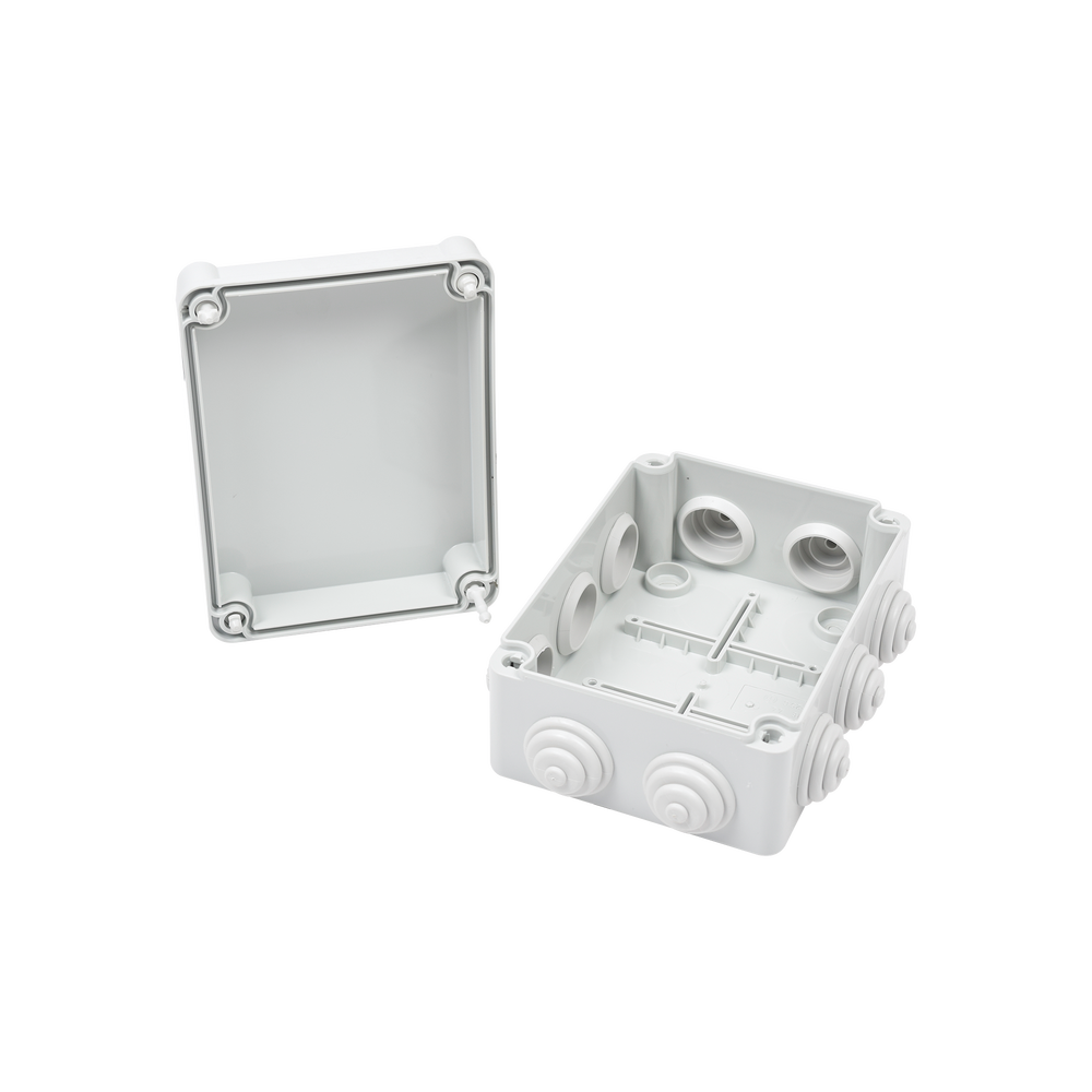Caja Estanca de PVC Para Derivación y Conexión, 10 Entradas, Tapa con Tornillo de 1/4″ de Vuelta, 150x110x70 mm (Área interna), Uso Exterior IP55, Material que no Propaga el Fuego y Libre de Hálogenos