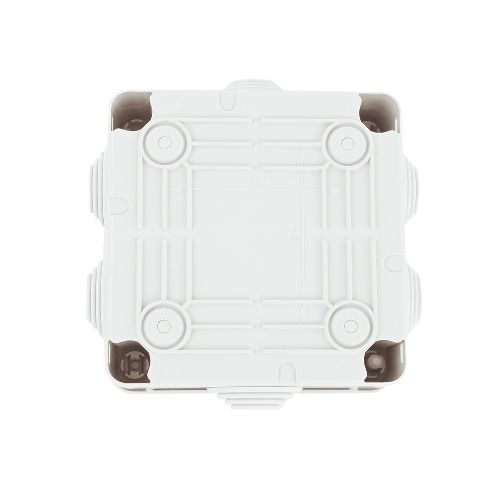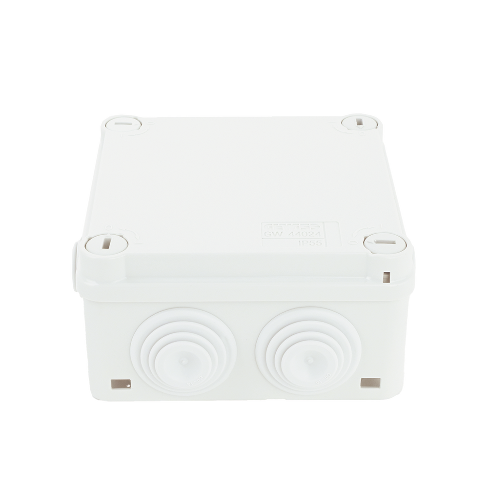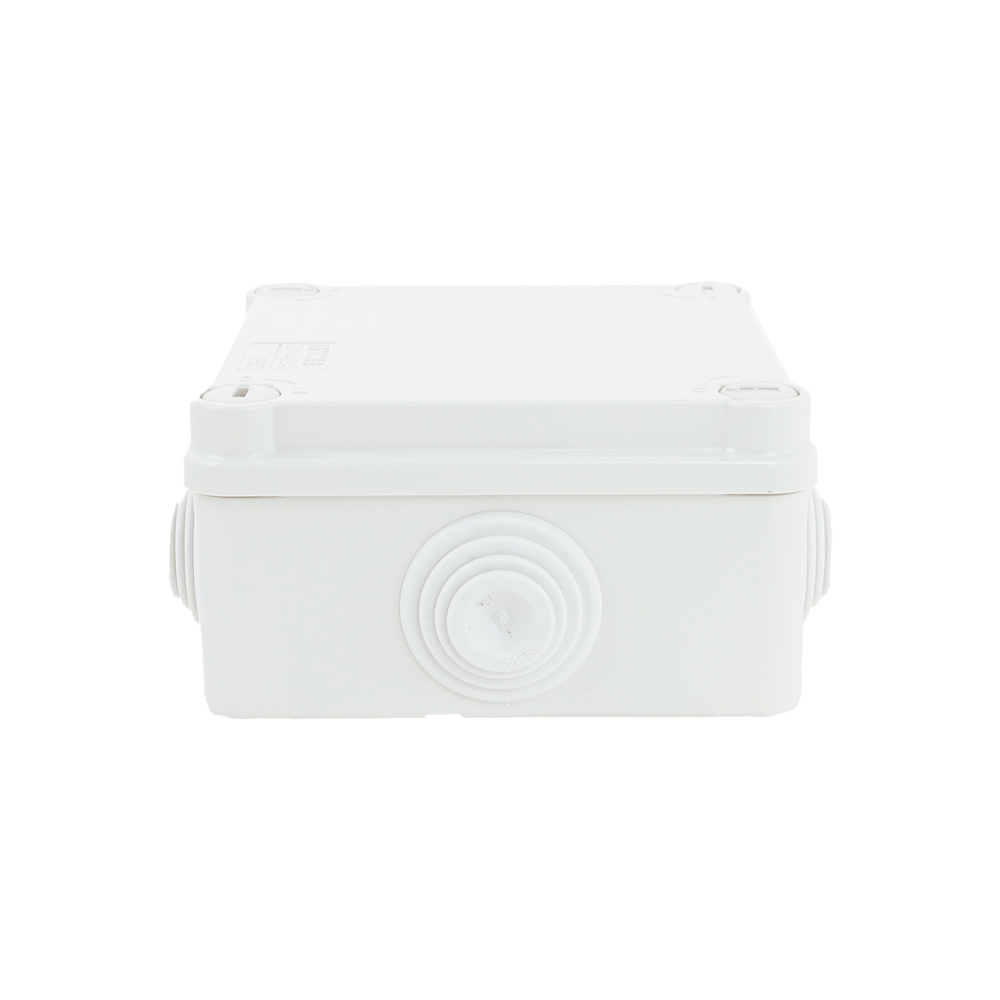 Caja Estanca de PVC Para Derivación y Conexión, 6 Entradas, Tapa con Tornillo de 1/4″ de Vuelta, 100x100x50 mm (Área Interna), Uso Exterior IP55, Material que no Propaga el Fuego y Libre de Hálogenos