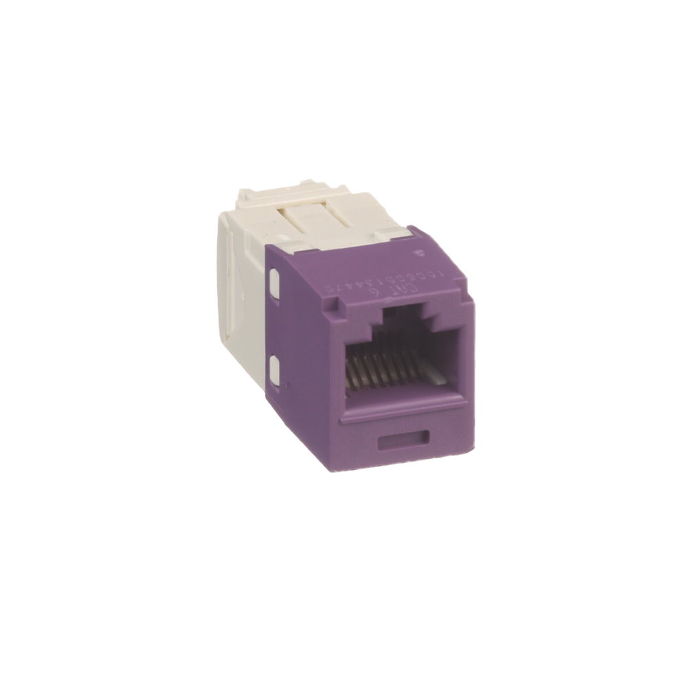 El módulo de conector UTP Categoría 6/Clase E de 8 posiciones, se termina en cable de 4 pares 22 – 26 AWG de par trenzado sin blindaje de 100 ohms y no requiere el uso de una herramienta de impacto. Los módulos de conector UTP usan un método de terminación de movimiento hacia adelante para optimizar el rendimiento al mantener la geometría del par de cables mientras se elimina el destrenzado del conductor. La tapa de terminación esta codificada por color blanco para designar el rendimiento de la Categoría 6 e incluye una etiqueta universal codificada para los esquemas de cableado T568A y T568B.