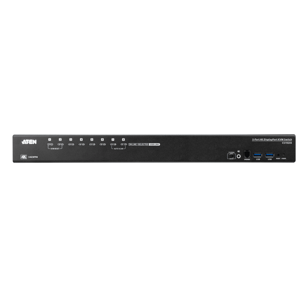 El switch KVM ATEN CS19208 permite controlar hasta 8 PCs con DisplayPort desde una sola consola USB, con soporte de video hasta 4K DCI (4096×2160 @60Hz). Ofrece expansión en cascada hasta 128 equipos y función multipantalla con hasta 8 monitores. Incorpora tecnologías ATEN como Video DynaSync™ y EDID Expert™ para mejorar la resolución y conmutación fluida. Integra hub USB 3.1 Gen 1 (5 Gbps) y múltiples formas de control (botones, teclas, OSD, RS-232). Con seguridad por contraseña de dos niveles, es ideal para entornos profesionales que requieren alto desempeño visual y multitarea.