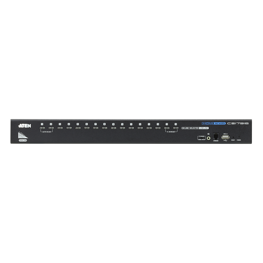 El switch KVM HDMI USB de 16 puertos CS17916 de ATEN permite controlar hasta 16 ordenadores con HDMI desde una única consola USB. Puede conectarse en cascada hasta dos niveles, controlando hasta 256 ordenadores. Ofrece funcionalidad multimonitor con apilamiento de hasta 8 conmutadores y soporte para varias tarjetas de vídeo, facilitando la comparación y monitoreo de vídeo. Incluye un menú de pantalla (OSD) para acceder a cualquier ordenador conectado y permite copias de seguridad/restauración de la configuración. Soporta teclado multimedia y audio habilitado, permitiendo escuchar el audio de cada ordenador en dos conjuntos de altavoces.