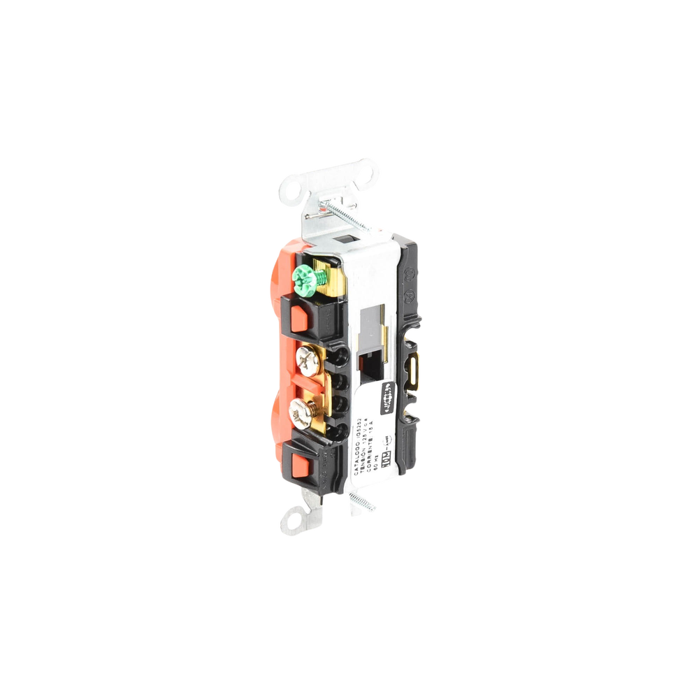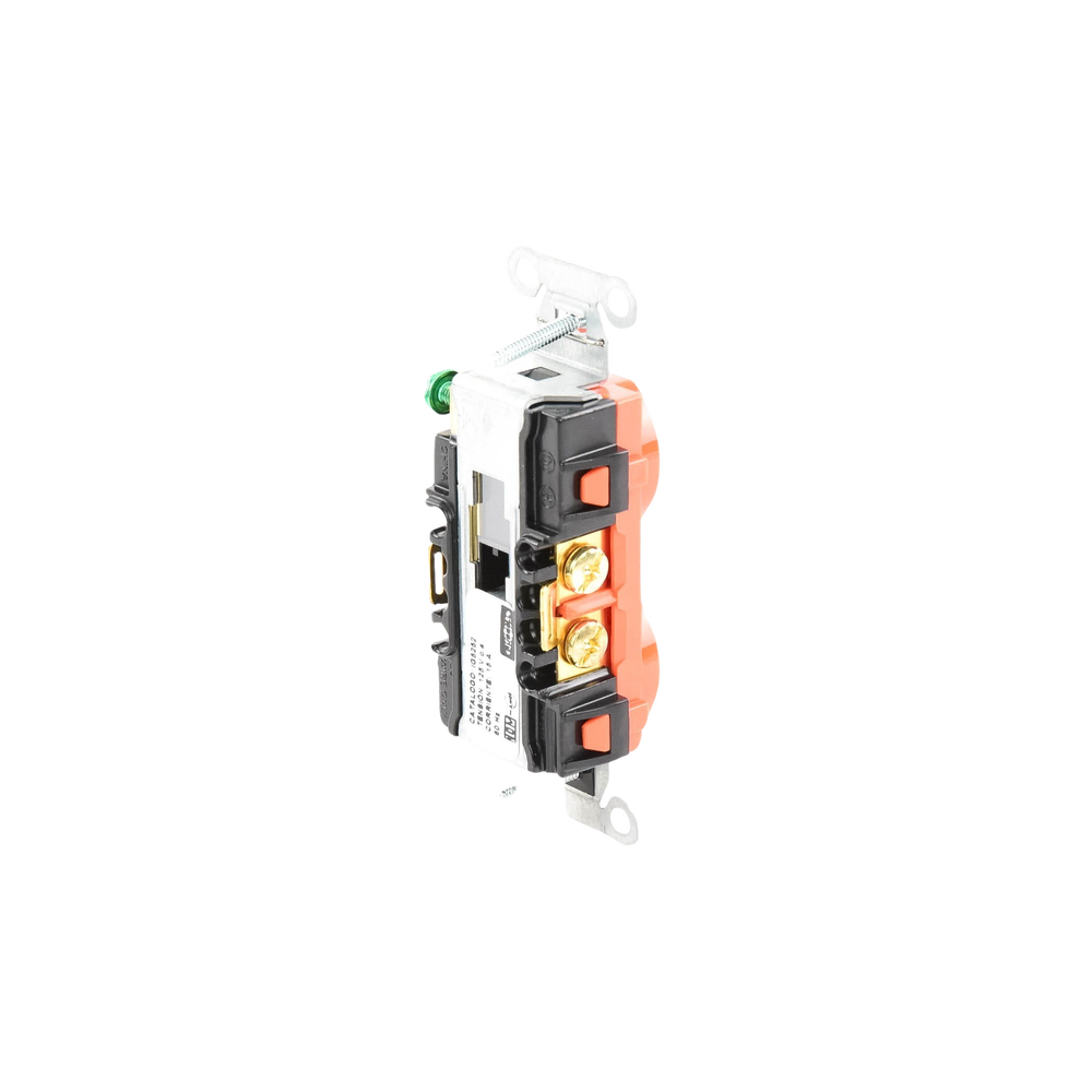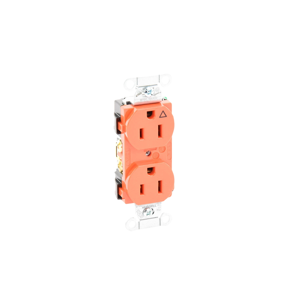 Contacto dúplex, grado comercial, 2 polos, 3 cables, 15A 125V, NEMA 5-15R, color naranja.