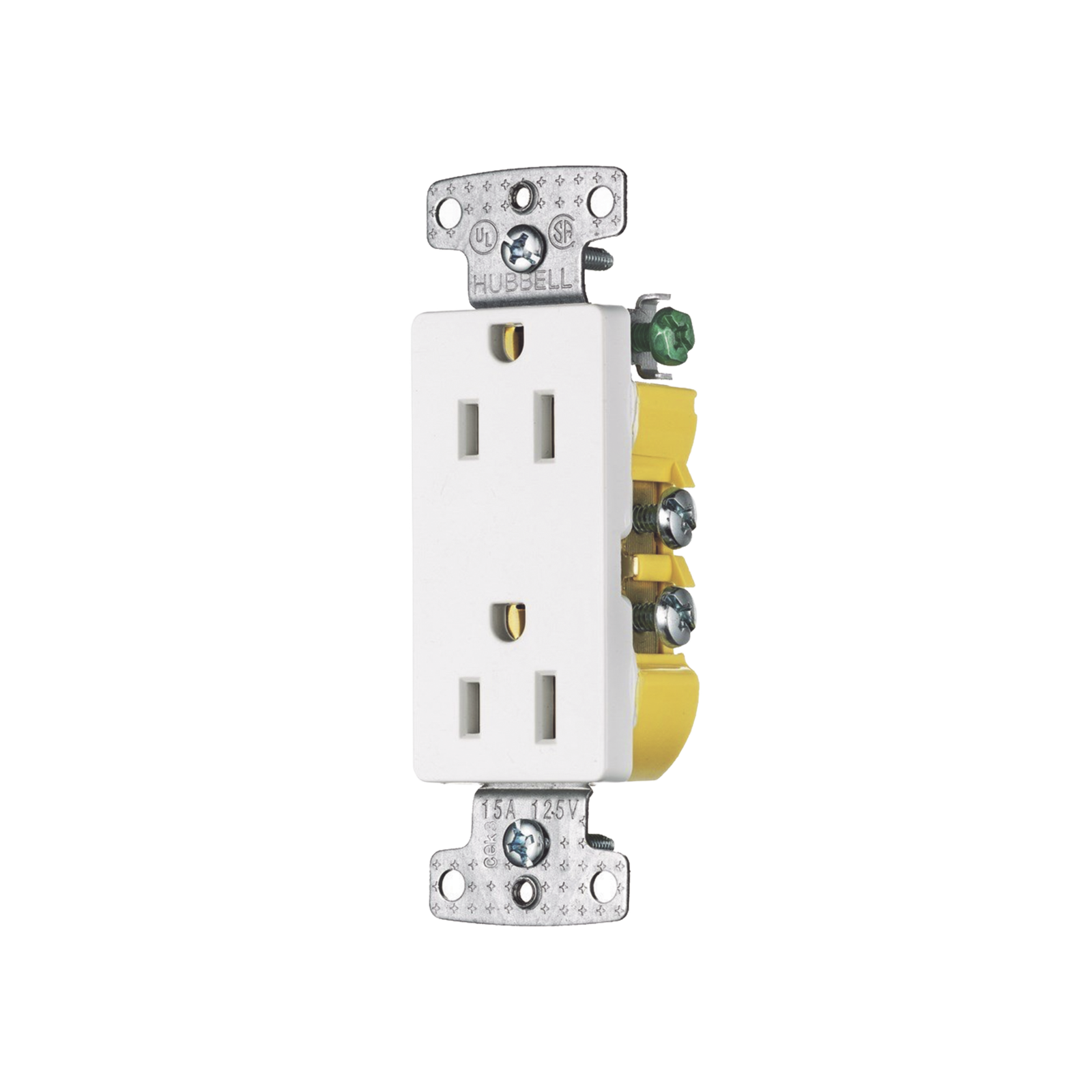 Dispositivos de hoja recta, receptáculo grado residencial, dúplex, decorador, 15A 125V, conexión a tierra de 2 polos y 3 cables, 5-15R, terminales de empuje, color blanco.