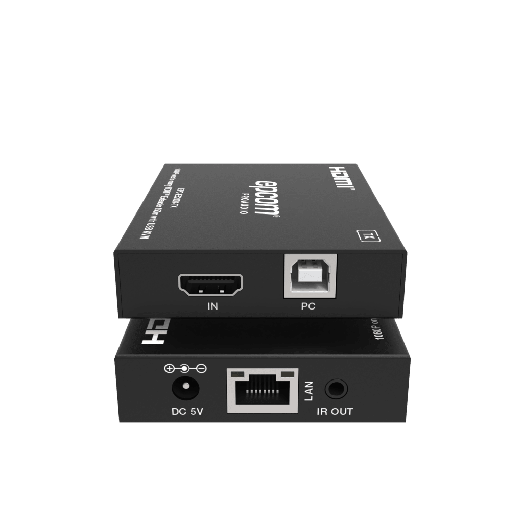 El extensor HDMI sobre IP EPC-E5200K es una solución profesional de distribución de video que utiliza codificación/decodificación estándar H.265 para transmitir contenido HD hasta 150 metros mediante cable Cat5e/6. Este sistema bidireccional incluye codificador y decodificador, ofreciendo funcionalidad KVM USB integrada, control IR unidireccional y compatibilidad con switches de red estándar de 1G. Ideal para aplicaciones comerciales, educativas y de entretenimiento que requieren extensión de señal HDMI a largas distancias con calidad 1080P@60Hz.