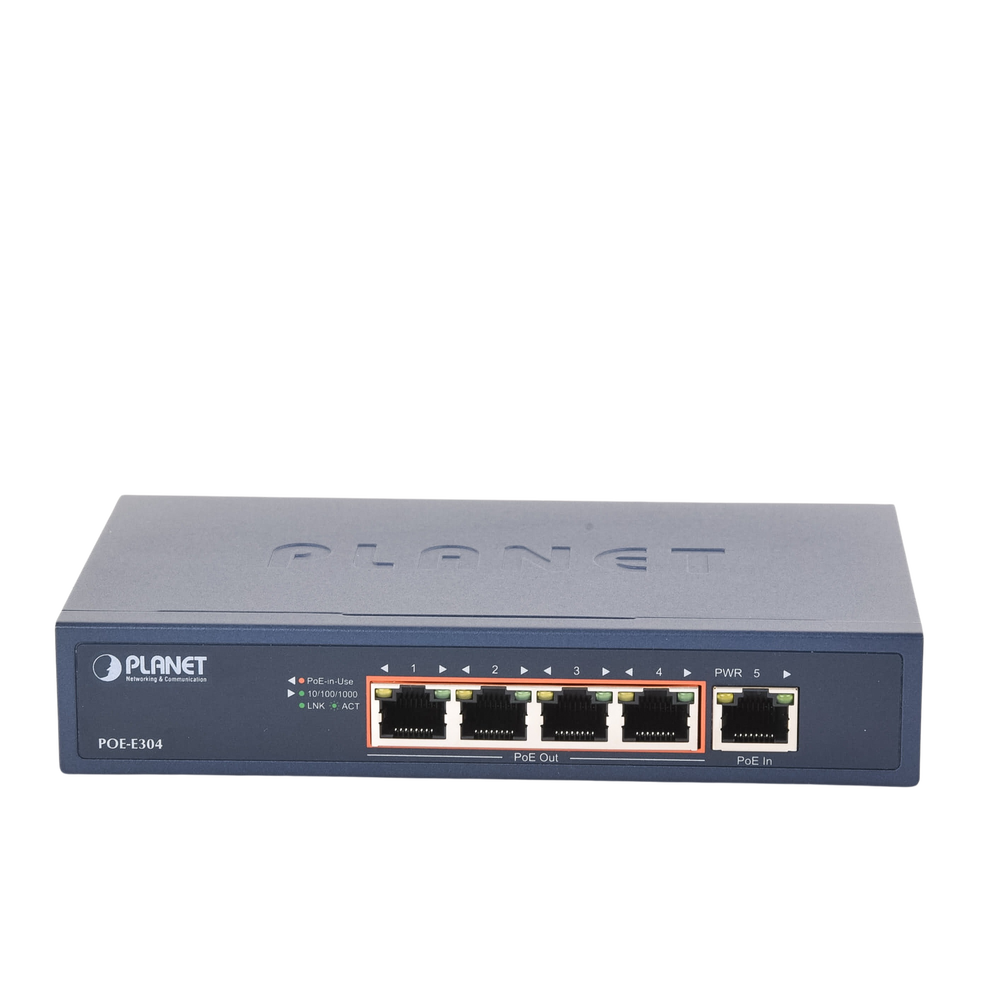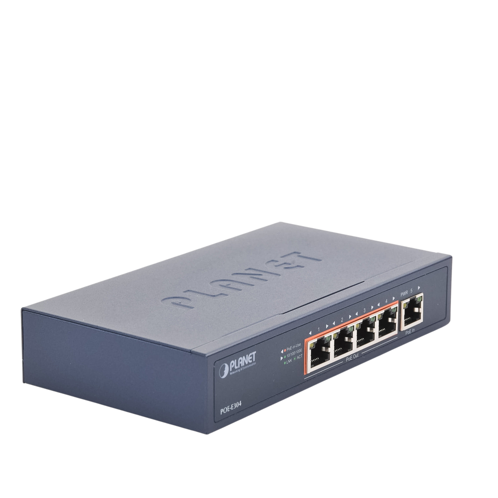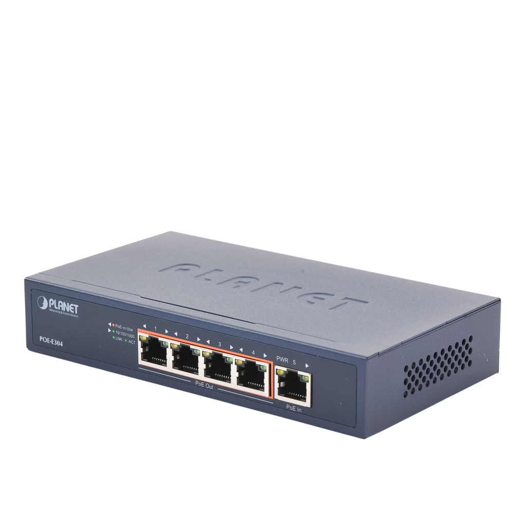 • LED Indicators: PoE In Port: 10/100 LNK/ACT (Orange), 1000 LNK/ACT (Green). PoE Out Port 1 to Port 4: 10/100 LNK/ACT (Orange), 1000 LNK/ACT (Green), PoE-in-Use (Orange), PoE Max. (Orange)
