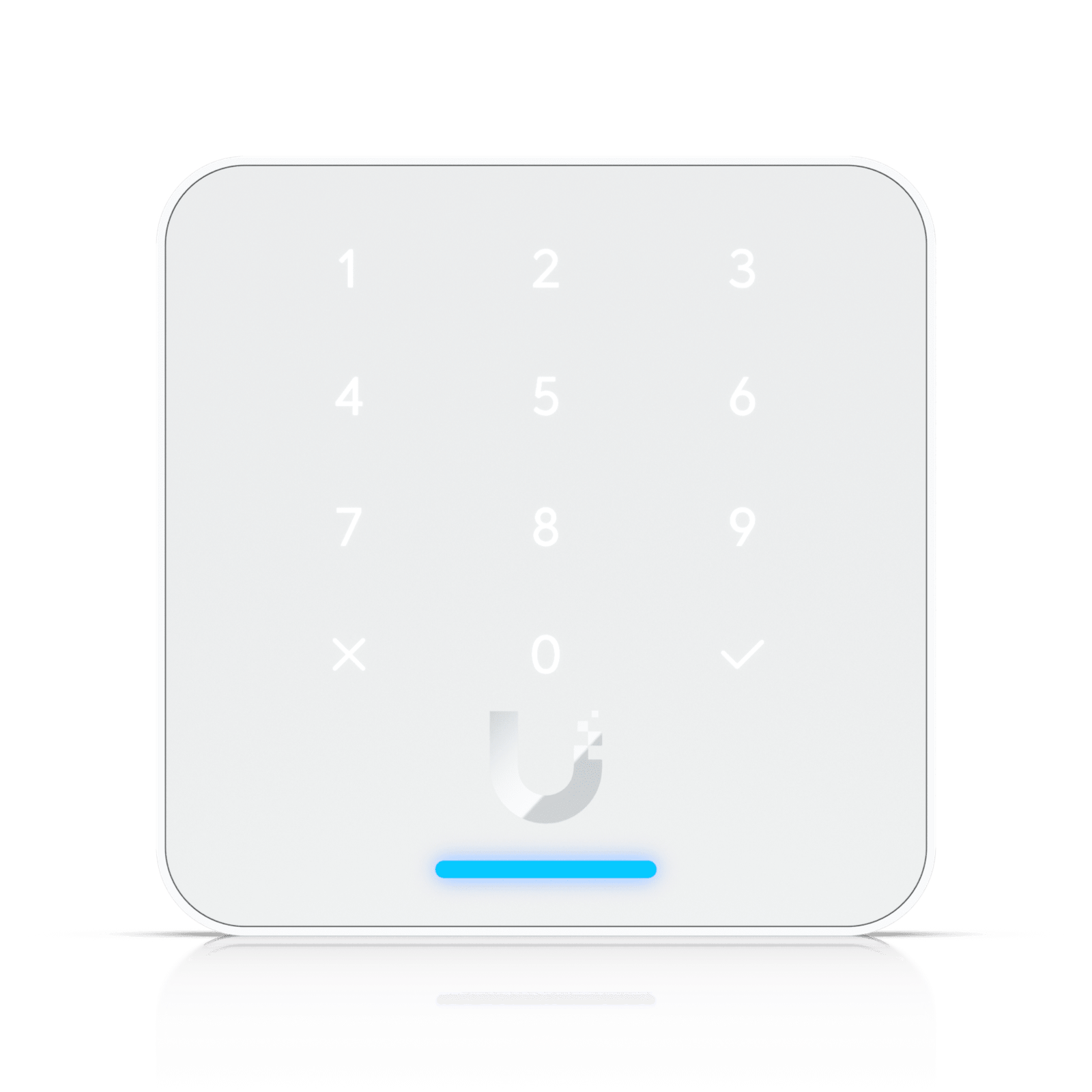 Lector de acceso compacto con teclado capacitivo de 12 botones, soporte para tarjetas y llaveros NFC, Apple Wallet / Google Wallet y desbloqueo móvil, ideal para instalaciones UniFi Access en interior o exterior.