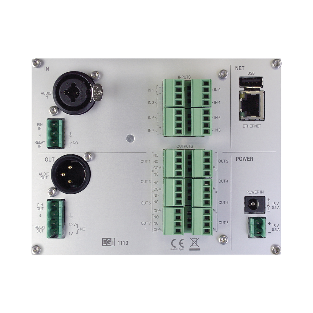- Interfaz de audio IP que permite la emisión/recepción de audio y mensajes pregrabados a través de redes Ethernet. Con 8 relés IN/OUT para su conexión con sistemas de seguridad, alarmas de incendio, domóticos, etc.
