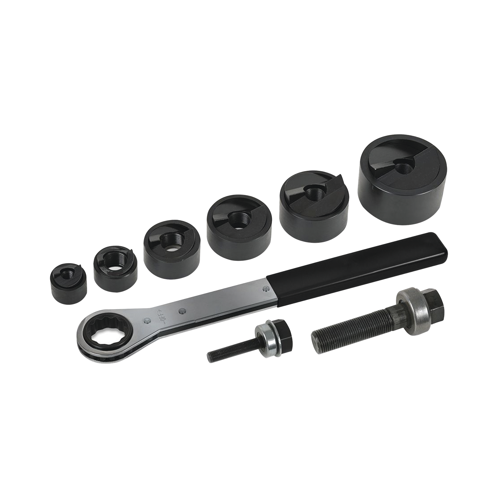 - El kit incluye seis tamaños diferentes de punzones sacabocados y matrices, dos pernos de tracción y una llave con extremo estriado y matraca.