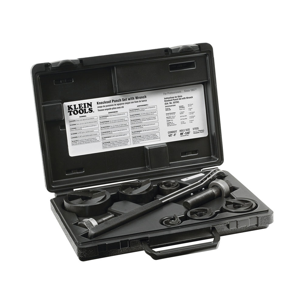 - El juego de punzones incluye una llave de 25 mm (1′) con matraca, punzones sacabocados, matrices y pernos de tracción para los siguientes tamaños de tubos conduit: 13 mm (1/2′), 19 mm (3/4′), 25 mm (1′), 32 mm (1-1/4′), 38 mm (1-1/2′) y 51 mm (2′).