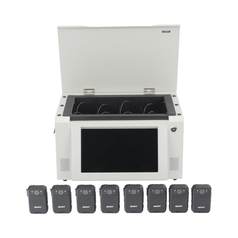 Estación para BodyCam, realiza la descarga de información y carga de batería simultáneamente, la estación se conecta por Ethernet para la descarga de información al servidor central dedicado (FTP).