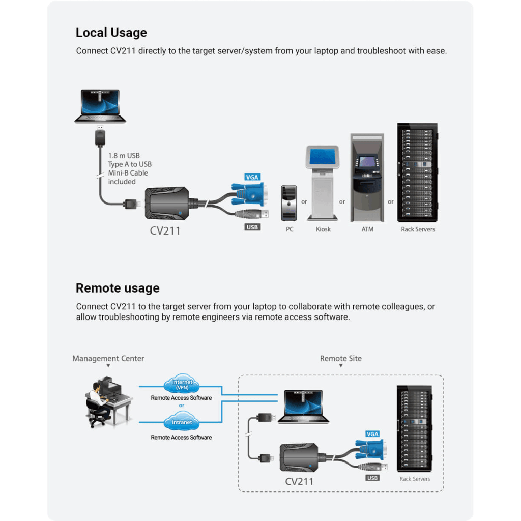 El CV211 de ATEN es un adaptador para consola KVM USB diseñado para administradores de TI móvil frustrados. Es el sustituto perfecto para el carrito de emergencia, ya que convierte el ordenador portátil en una consola KVM que combina la funcionalidad de un conmutador, una caja de captura, un DVD-ROM externo, un teclado, un ratón y un monitor en una unidad compacta y práctica. Podrá diagnosticar y resolver de forma rápida y profesional servidores, cajeros automáticos o sistemas de punto de venta.