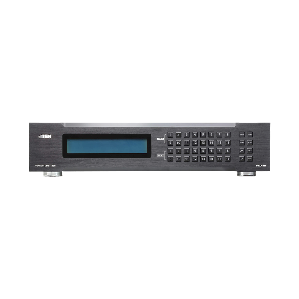 El VM51616H es un switch de matriz HDMI 16 x 16 que permite redirigir 16 fuentes de vídeo y audio HDMI a 16 pantallas HDMI. Este dispositivo está diseñado para ofrecer conmutación fluida entre las entradas, un escalador de alto rendimiento para mantener la calidad del vídeo, y funciones avanzadas de pared de vídeo con una interfaz gráfica de usuario intuitiva. Ideal para su uso en estaciones de tren, casinos, centros de control y más, el VM51616H proporciona una solución completa para la gestión y distribución de señales HDMI en entornos complejos.