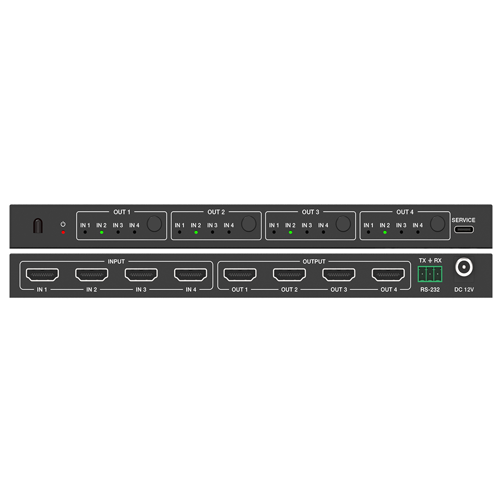 Este es un conmutador matricial 4×4 sin interrupciones que también puede utilizarse como procesador de video wall. En modo conmutador, puede mostrar cualquiera de las 4 entradas HDMI en cualquiera de las 4 salidas HDMI. En modo video wall, divida una pantalla en 2 a 4 dispositivos, creando una pantalla gigante con múltiples pantallas. Este producto cumple con HDCP y admite resoluciones de hasta 4K2K@30. Las resoluciones de salida HDMI pueden escalarse hacia arriba o hacia abajo a 1080P/720P/1920×1200/4K30. El producto puede controlarse mediante los botones del panel frontal, el control remoto IR y los comandos RS-232. Este producto multifuncional puede utilizarse ampliamente en diversas aplicaciones como demostraciones, videoconferencias y enseñanza multimedia.