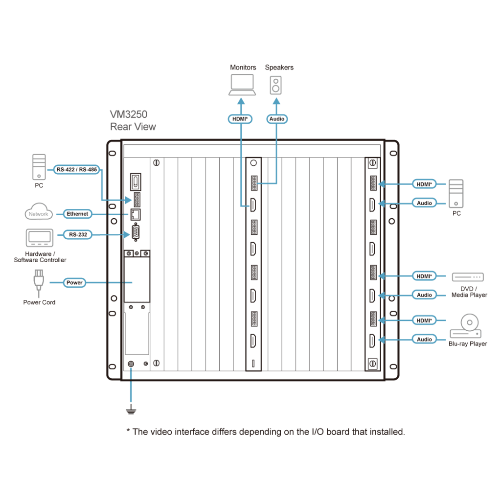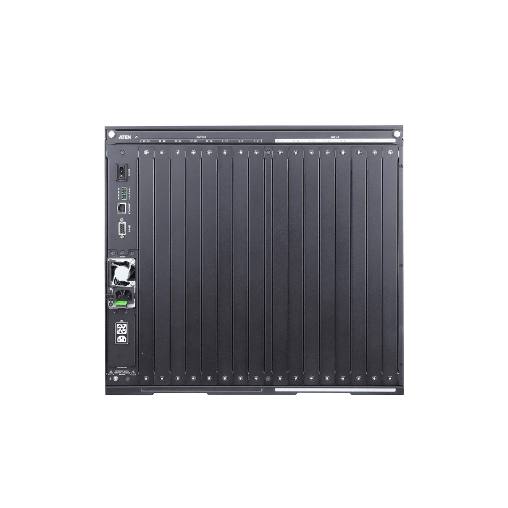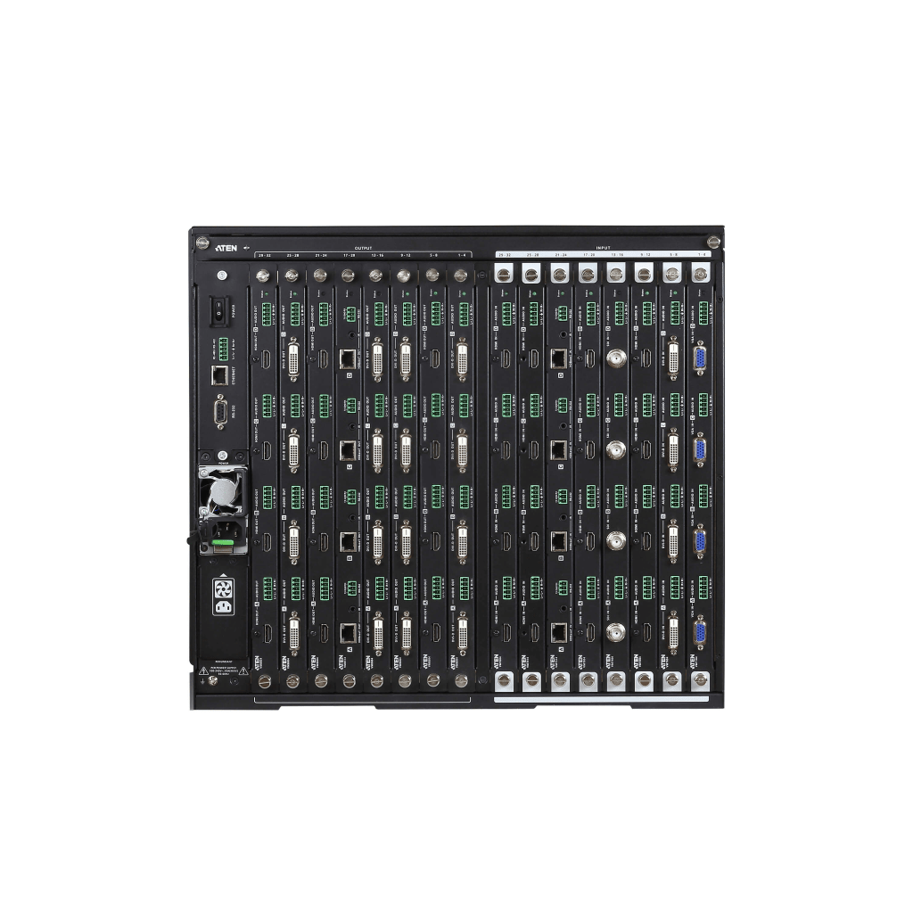 El VM3250 se puede ampliar fácilmente y aloja una selección de tarjetas de E/S ATEN que pueden intercambiarse en caliente. Equipado con conversión de señal automática, permite diversas combinaciones de interfaces de vídeo digital y analógico, incluidas Fibra óptica, HDBaseT, DisplayPort, HDMI, DVI, 3G-SDI y VGA. La flexibilidad y la capacidad de expansión hacen que resulte ideal para aplicaciones de A/V a gran escala, como emisoras, salas de control de tráfico y relacionadas con el ámbito del transporte, centros de servicios de emergencia y toda aquella aplicación que requiera redirección de señal de A/V personalizable y de alta velocidad.