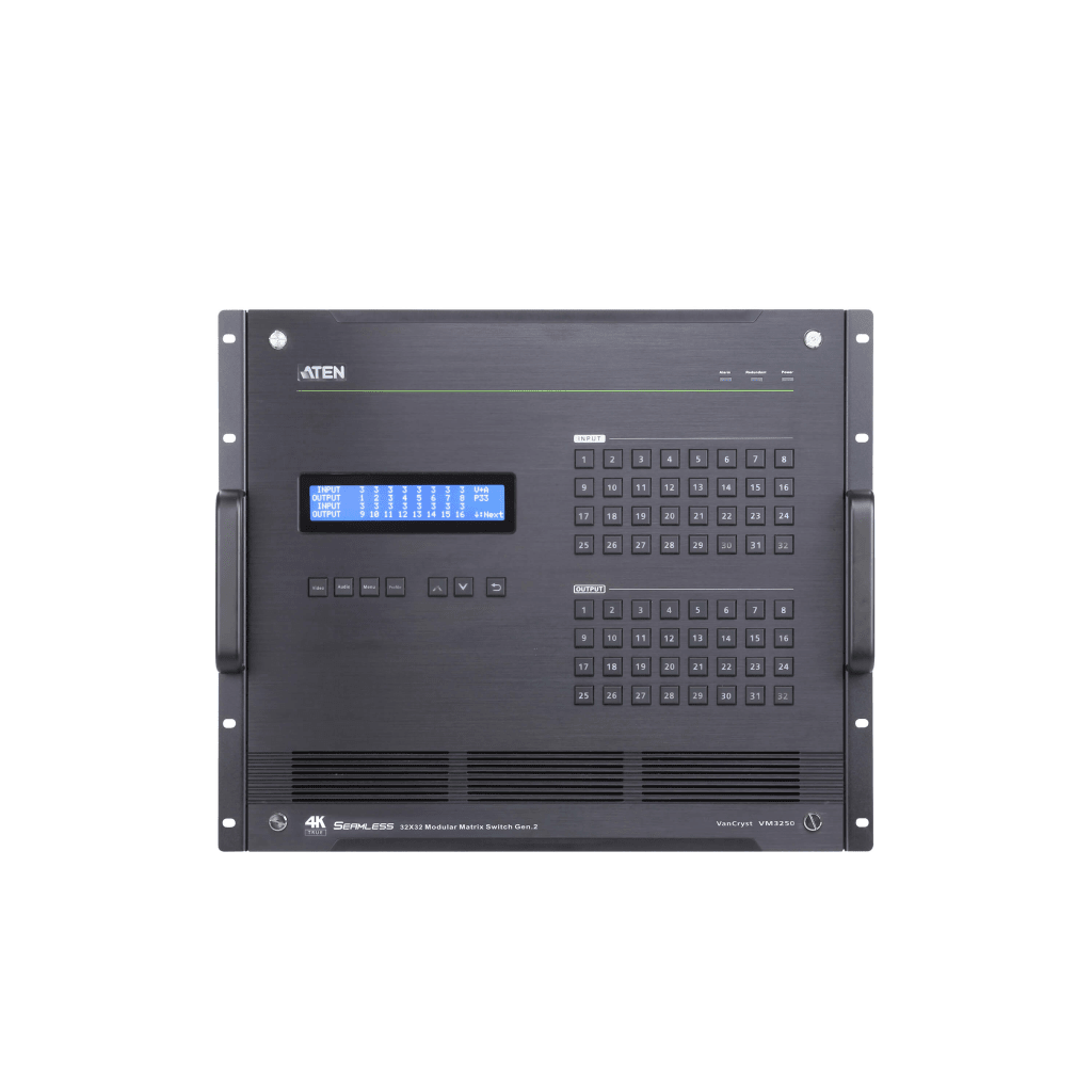 El switch de matriz modular VM3250 de 2.ª generación ofrece acceso avanzado y control en tiempo real de varios dispositivos de entrada de audio/vídeo y pantallas, tanto locales como remotos, desde un mismo chasis. El VM3250 permite a los usuarios conmutar y redirigir de forma independiente contenido de vídeo y/o audio directamente a varios monitores, pantallas, proyectores y/o altavoces con los pulsadores del panel delantero. El escalador integrado codifica el formato de vídeo para ofrecer conmutación fluida en tiempo real. El LCD del panel delantero muestra una vista rápida de las conexiones de puerto activas. El switch también incluye la posibilidad de seleccionar un Modo EDID que ofrece la máxima resolución en varios monitores.