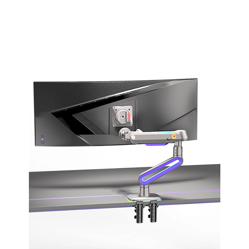 Montaje de Escritorio Ideal Para Monitores Gaming de 32″- 60″ / Capacidad de Carga Maxima 20 Kg / Vesa 75 x 75 – 100 x 100 / Acero / Giro 360° / Color Carbon Mate con Cubierta Plastica Color Morado / Iluminación RGB