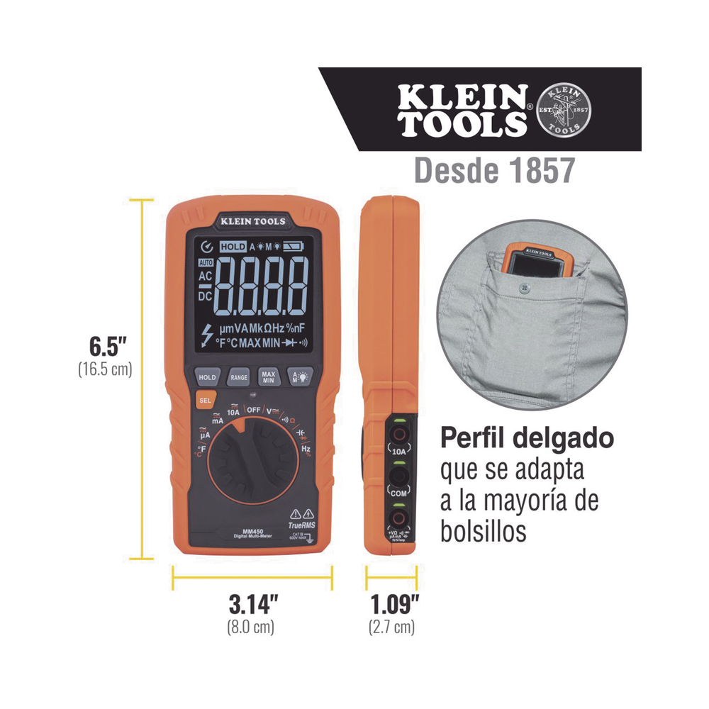 - El perfil delgado permite que el multímetro se adapte de manera práctica a la mayoría de los bolsillos