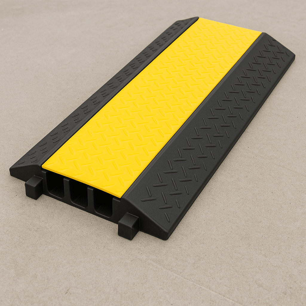 El protector de cable de 3 canales modelo AC903CV (sin marca especificada) está diseñado para proteger cables en entornos industriales y comerciales. Su propósito principal es garantizar la seguridad al minimizar el riesgo de tropezones y daños a los cables, con una capacidad de soportar hasta 6.1 toneladas de peso por neumático gracias a su base robusta de goma y tapa de plástico.