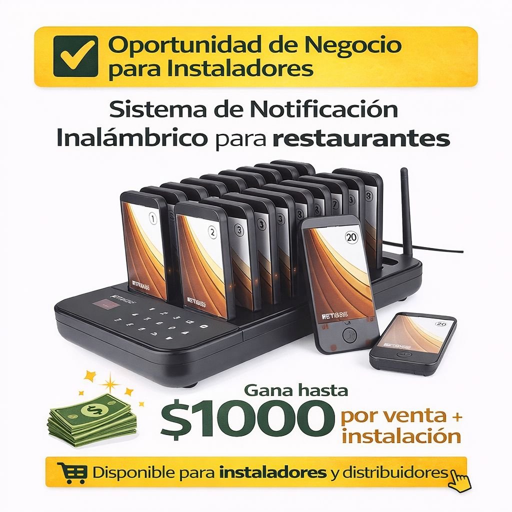 Sistema profesional de avisadores inalámbricos para restaurantes. Mejora tiempos de entrega, elimina filas y ofrece atención moderna a tus clientes. Ideal para instaladores y emprendedores que buscan generar ingresos instalando soluciones tecnológicas.