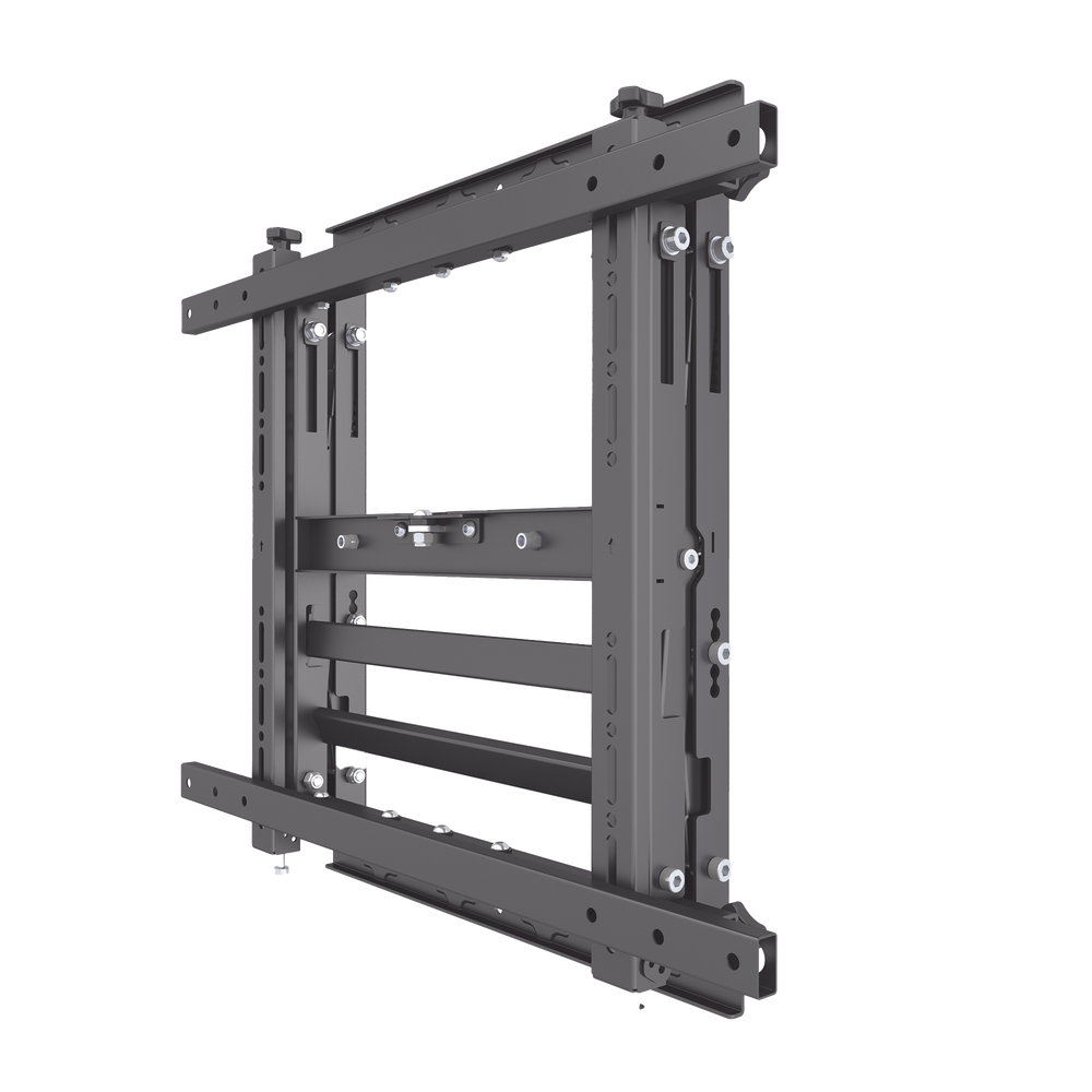 - Diseñado para que la instalación de videowalls sea lo más rápida y sencilla posible, este soporte modular para videowalls se puede utilizar para crear configuraciones ilimitadas de videowalls tanto en formato horizontal como vertical. El sistema desplegable permite un acceso rápido y sencillo a la parte posterior de las pantallas montadas para realizar tareas de mantenimiento.