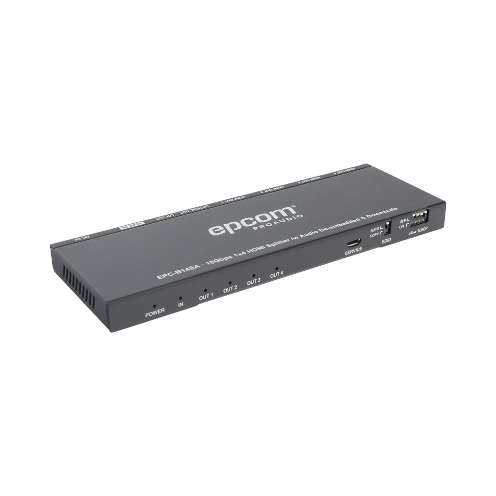 El divisor HDMI 2.0 1×4 conecta simultáneamente una fuente HDMI a una pantalla HDMI de cuatro rutas. Admite resolución de hasta 4K2K@60Hz (4:4:4) y HDCP 2.2. Este producto admite la extracción de audio desde una fuente HDMI a una salida óptica y analógica. Se puede seleccionar COPIA, modos AUTO y configuración EDID. La salida admite la función de derivación y reducción de escala (4K->1080P).