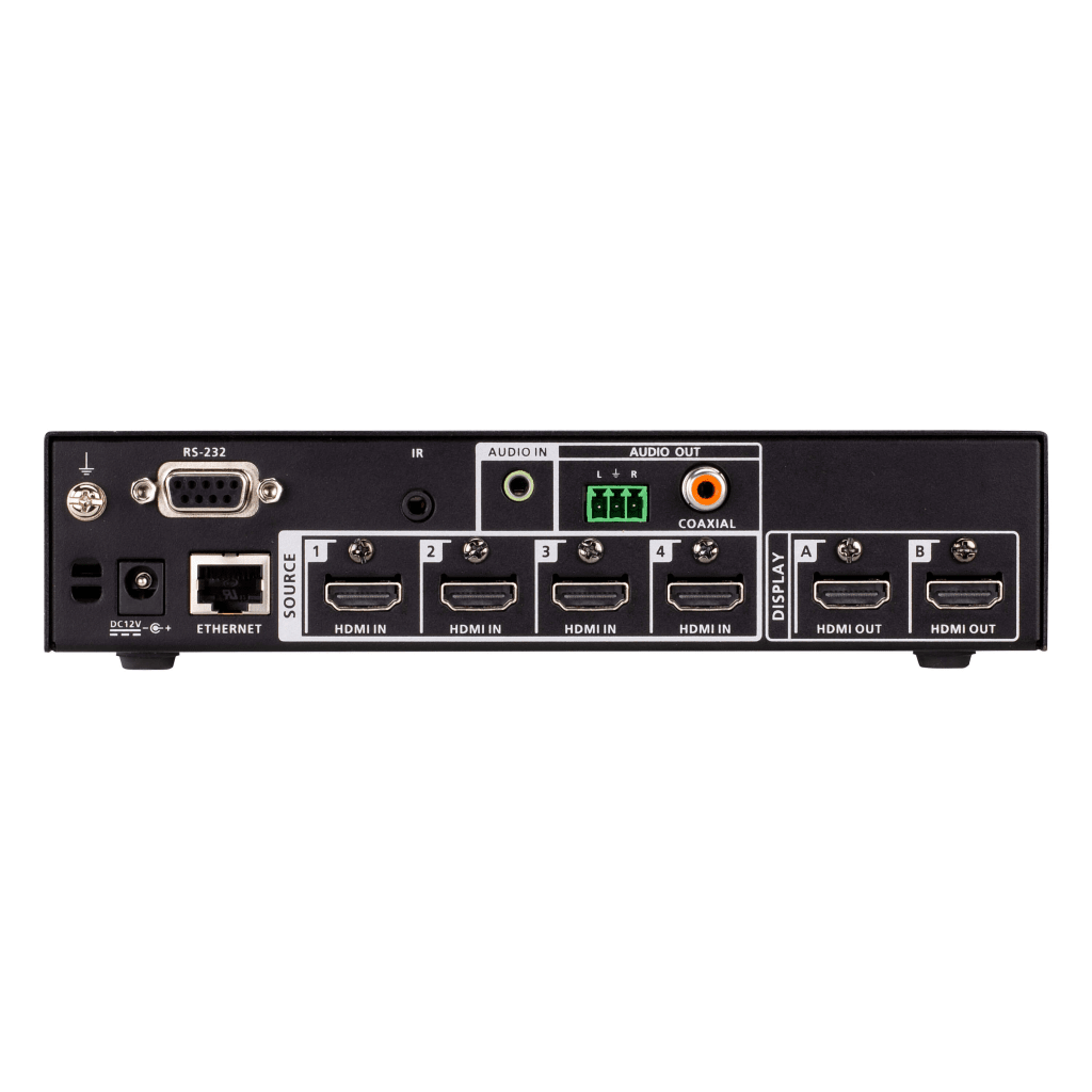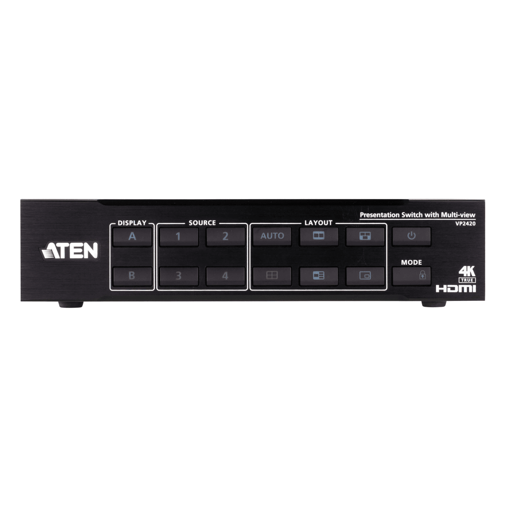 El VP2420 es un conmutador de presentación que cuenta con 4 entradas HDMI y 2 salidas HDMI, capaz de mostrar contenido de vídeo en pantalla completa, PiP, PbP, triple/quad multi-view. Ofrece modos de visualización (Matriz/Espejo) y modos de diseño (Auto/Manual) seleccionables, así como capacidad de conmutación sin interrupciones entre múltiples fuentes, lo que brinda una experiencia visual dinámica en cualquier entorno de conferencia. Soporta una resolución de hasta 4096 × 2160/3840 × 2160 a 60Hz (4:4:4) y cuenta con un escalador 4K integrado para garantizar una calidad visual nítida y detallada. Incluye funcionalidades de incrustación y extracción de audio, permitiendo combinar adecuadamente audio y vídeo según el entorno. Diseñado para flexibilidad, el VP2420 ofrece múltiples opciones de control, incluyendo botones frontales, RS-232, IR, Telnet, interfaz web y aplicación móvil de control de presentación, permitiendo gestionar e integrar fácilmente señales multimedia en eventos colaborativos.