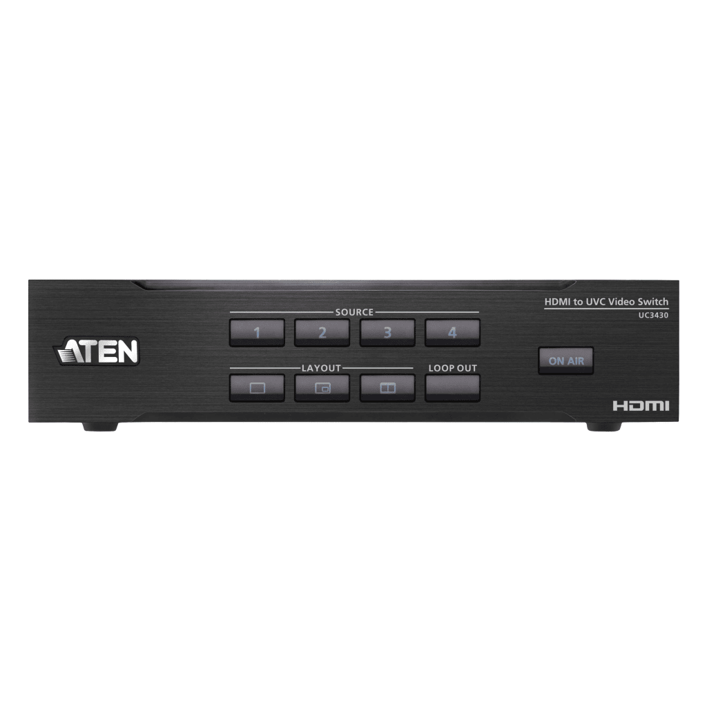 El UC3430 CAMLIVE PRO 4K es un switcher de video HDMI a USB que permite capturar, mezclar y transmitir hasta cuatro fuentes 4K en un solo flujo. Integra mezclador de audio, efectos avanzados y salida USB-C para streaming en vivo, ideal para producción multicámara, eventos y contenido profesional